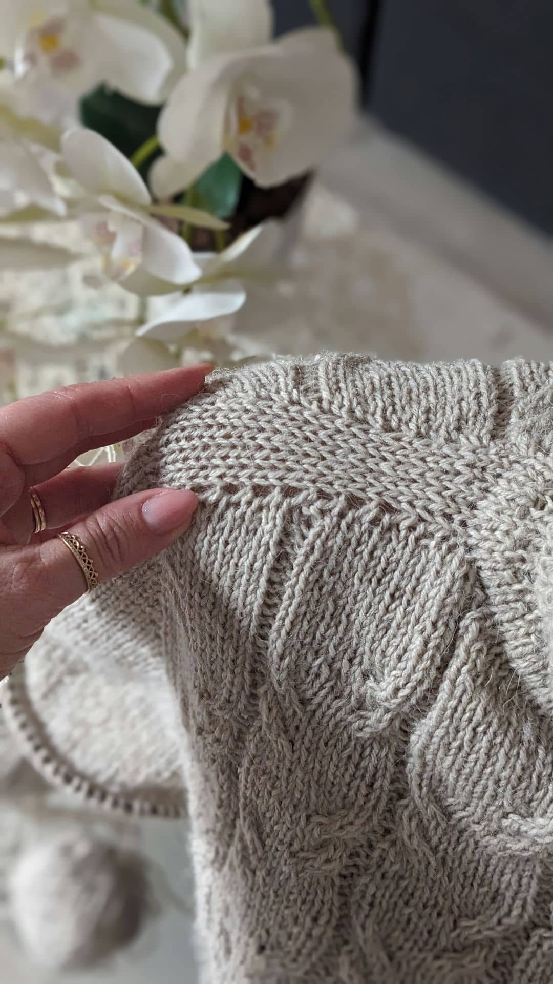 Починаємо розширення полотна рукавів із 6 петель плеча з обох сторін в кожному 2-му рядку. Перед петлями рукава додаємо нову петлю з останньої петлі спинки/переда, вводячи спицю на ряд нижче. Після петель рукава додаємо нову петлю з першої петлі спинки/переда, вводячи спицю на ряд нижче (дивись у відео нижче – частина 1).