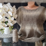 Соединяем детали переда и спинки, выполняем плечевые и боковые швы. В верхней части оставляем отверстия для рук, высота проймы около 20-21 см. От основной детали начинаем вязать рукава лицевой гладью.