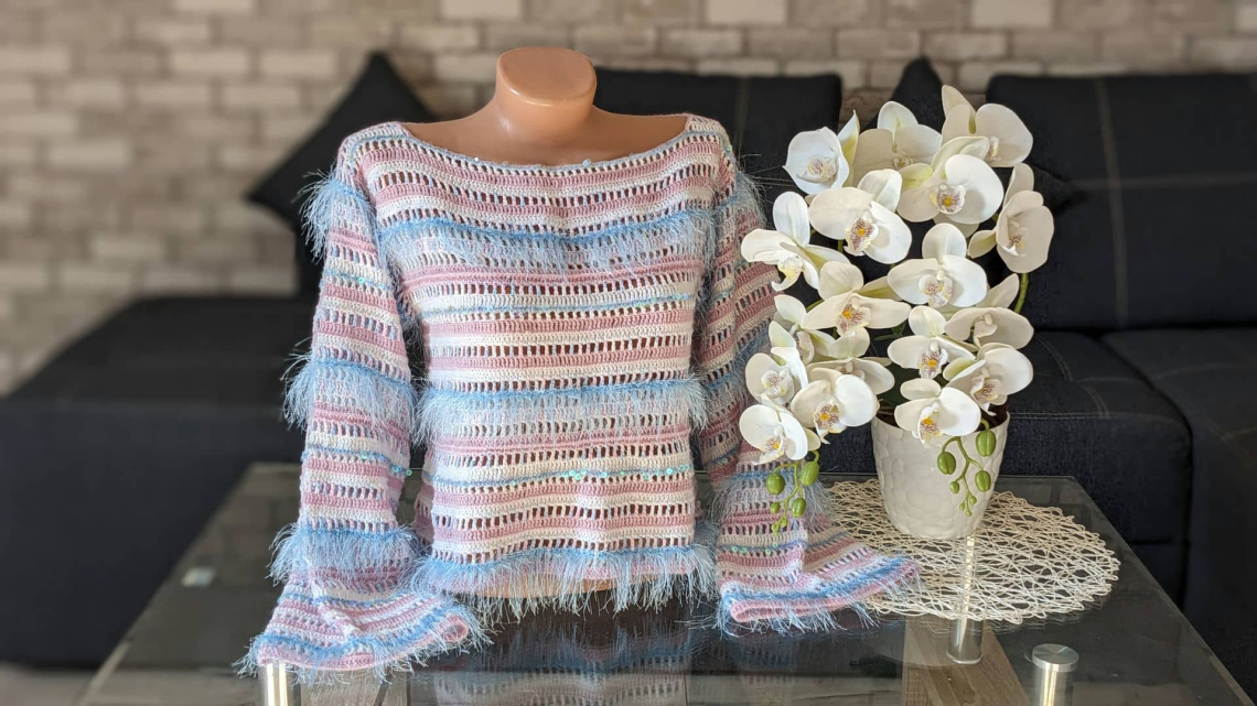 Смугастий джемпер гачком – це нова історія натхнення та любові до творчості. Він створений із залишків пряжі попередніх творчих процесів, що надає йому особливої цінності та унікальності. Кольорові смужки зі стовпчиків та повітряних петель плавно поєднуються в єдине полотно, формуючи філейний візерунок.