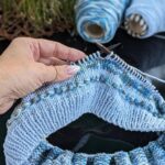 На спиці №5,5 пряжею блакитного кольору (БН) набираємо 160 петель + 1 петля для з’єднання в коло. Виконуємо 10 рядів резинкою 1х1.
