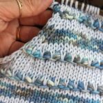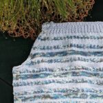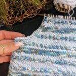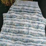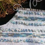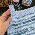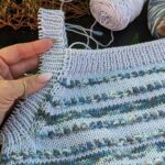 Продовжуємо в’язати окремо кожну частину зворотніми рядами, повторюючи смугастий візерунок. Для пройм з кожної сторони закриваємо по 6 петель, далі в кожному 2-му рядку виконуємо 11 разів зменшення 1 петлі. Ці зменшення петель виконуємо лише у рядках лицьової гладі, в рядках візерунка “вузлики” зменшення не виконуємо.
