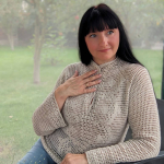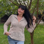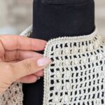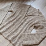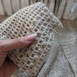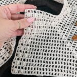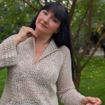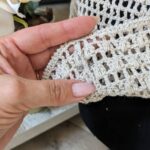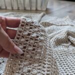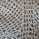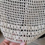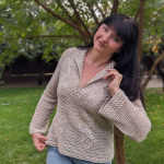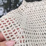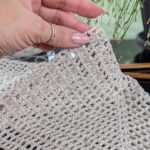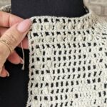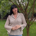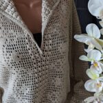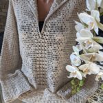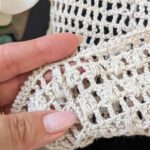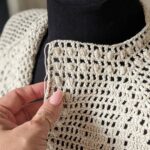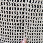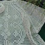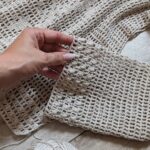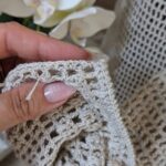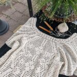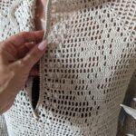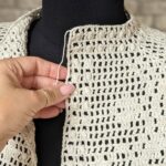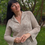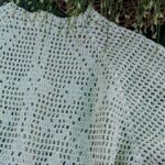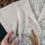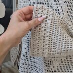 Рукава. Основна частина готова, переходимо до в’язання рукавів. По краях підрізів та ростка формуємо нові клітинки сітки. За необхідності кількість петель (клітинок) можна зменшити, виконуючи по краях рукава поступові зменшення стовпчиків або ПП. На кутках пройм двічі пров’язувала по 3 стовпчики з накидом із загальною вершиною, а далі, по обох краях рукава виконувала п’ять разів по 2 стовпчики з накидом із загальною вершиною.
