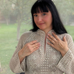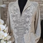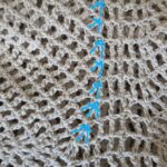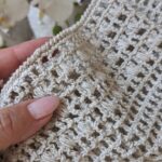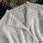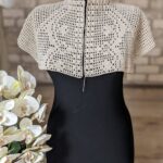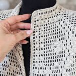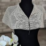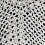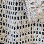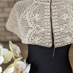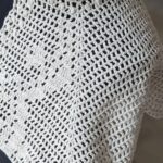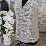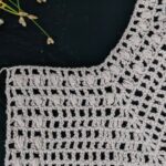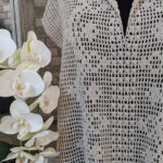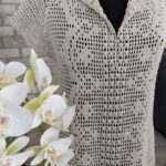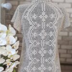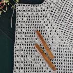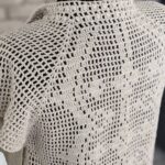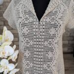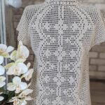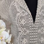 Спинка. Відразу після кокетки на спинці виконую 4 рядки азіатського ростка. Далі, у наступному рядку, по краях додаю ланцюжки по 10 ПП, це буде по 5 клітинок філейної сітки для кожного підрізу. Ширина спинки 77 клітинок. Продовжую в’язати спинку рівним полотном. По низу виконала декілька рядків із порожніх клітинок та клітинок із об’ємних стовпчиків.