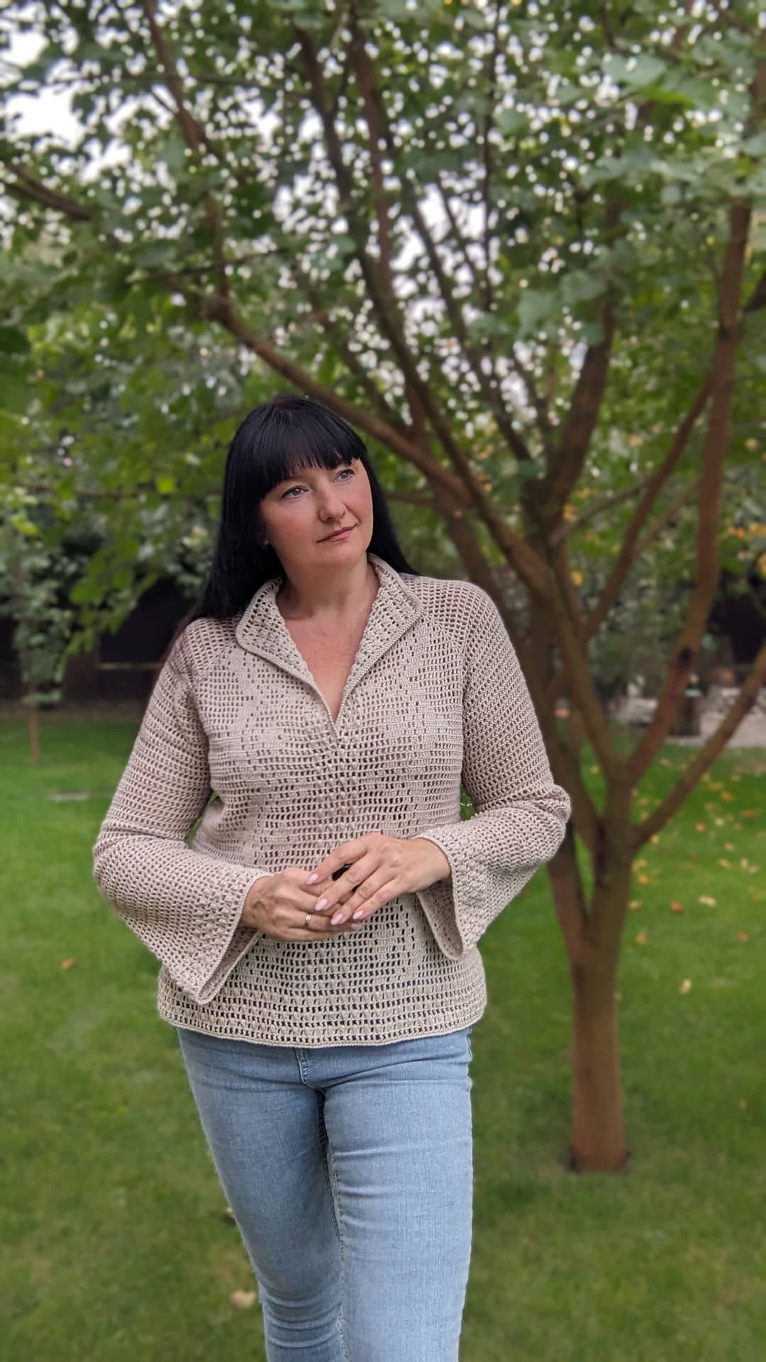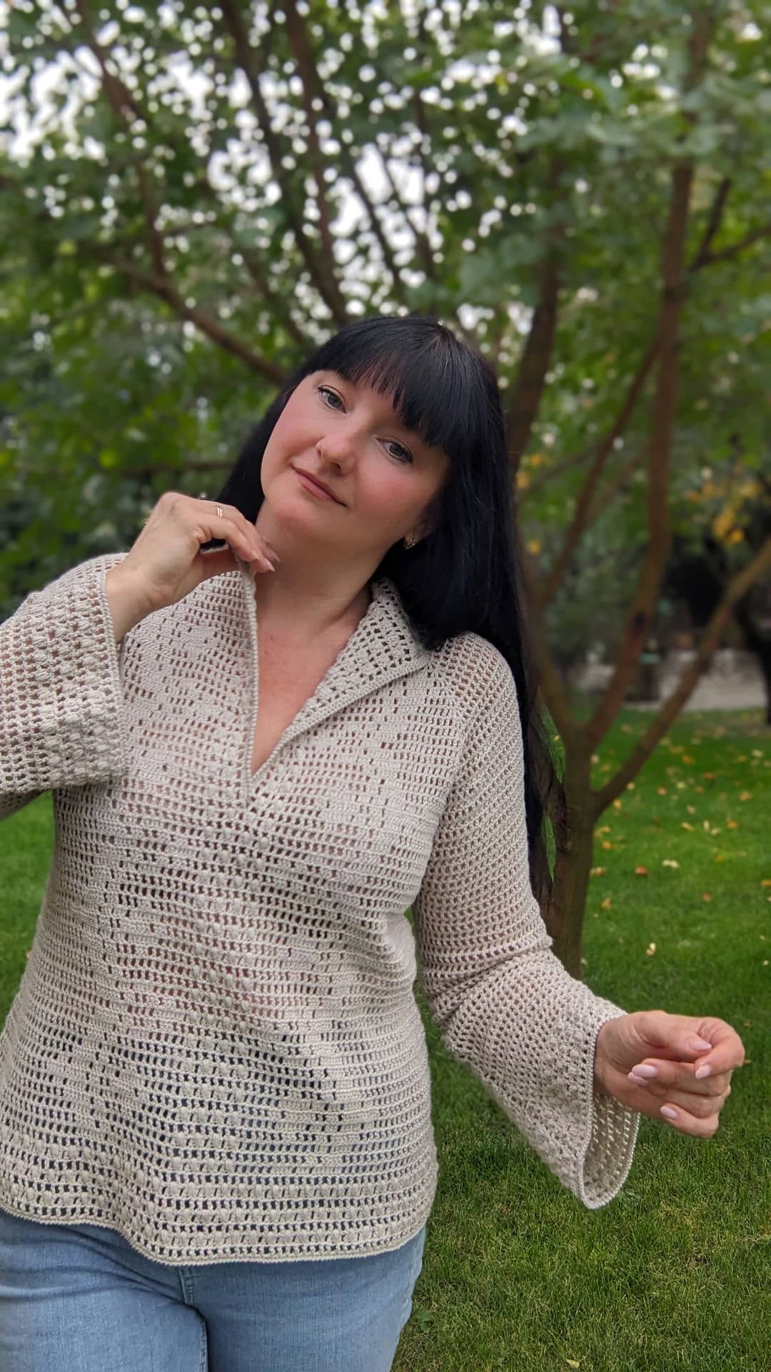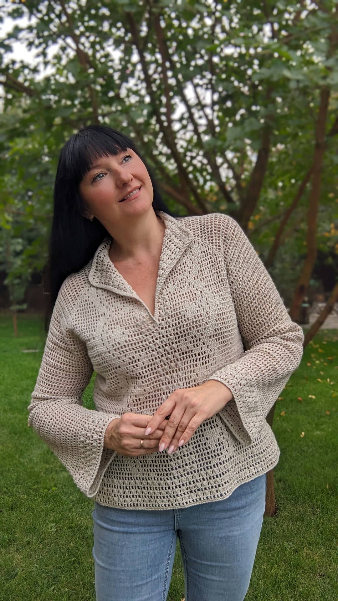Рукава. Основна частина готова, переходимо до в’язання рукавів. По краях підрізів та ростка формуємо нові клітинки сітки. За необхідності кількість петель (клітинок) можна зменшити, виконуючи по краях рукава поступові зменшення стовпчиків або ПП. На кутках пройм двічі пров’язувала по 3 стовпчики з накидом із загальною вершиною, а далі, по обох краях рукава виконувала п’ять разів по 2 стовпчики з накидом із загальною вершиною.