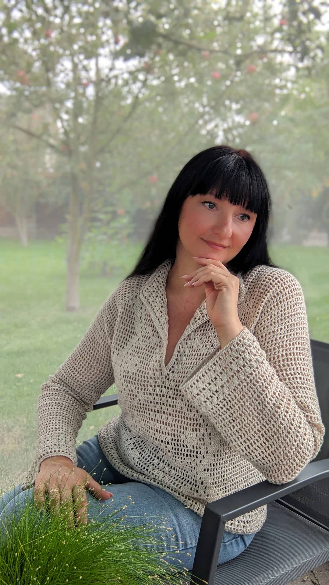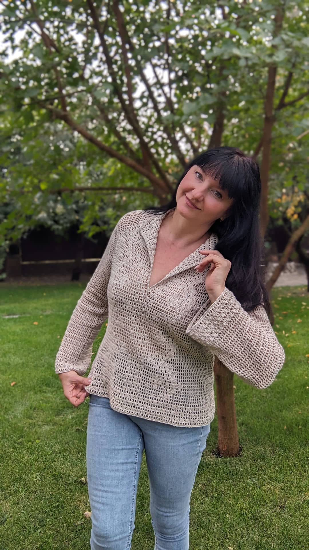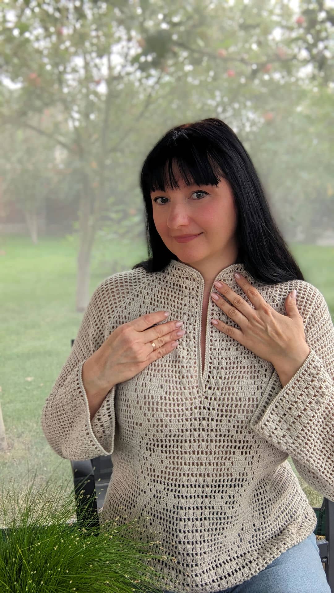 Рукава. Основна частина готова, переходимо до в’язання рукавів. По краях підрізів та ростка формуємо нові клітинки сітки. За необхідності кількість петель (клітинок) можна зменшити, виконуючи по краях рукава поступові зменшення стовпчиків або ПП. На кутках пройм двічі пров’язувала по 3 стовпчики з накидом із загальною вершиною, а далі, по обох краях рукава виконувала п’ять разів по 2 стовпчики з накидом із загальною вершиною.