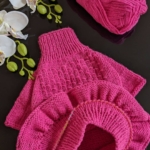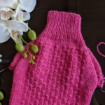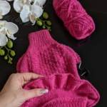 Переходимо на в’язання рукавів. На підрізах набираємо додаткові петлі, з’єднуємо їх з петлями рукавів та ЛР. В’яжемо рукава по колу лицьовою гладдю. Довжина рукава – 10 рядків. Далі 1 ряд – виворітні петлі. Закриваєм петлі класичним способом: по 2 разом лицьовою.