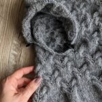 - через кожні 16 петель додаємо нову петлю із протяжки, пров’язуємо лицевою зхрещеною. Кількість петель на спицях буде такою: 288 + 18 = 306 петель.