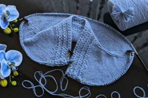 Бірюзовий кардиган спицями. Реглан – погон спицями